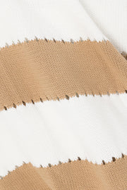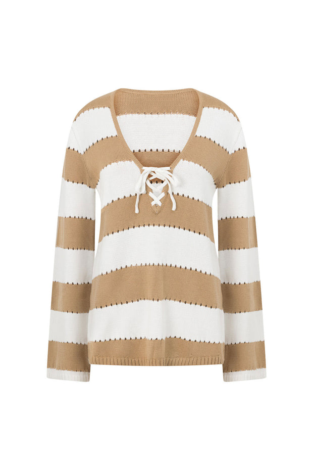 Wear it as a set or pair it back with jeans, the Akora Top is made from a soft knit fabric in white and tan hues. It is a relaxed style featuring ultra long boxy sleeves, V neckline with lace up detail, pointelle design detail trim stripes and ribbed trims throughout. Get the set with the Akora Skirt! Designed exclusively by Sabo.