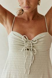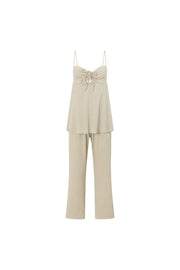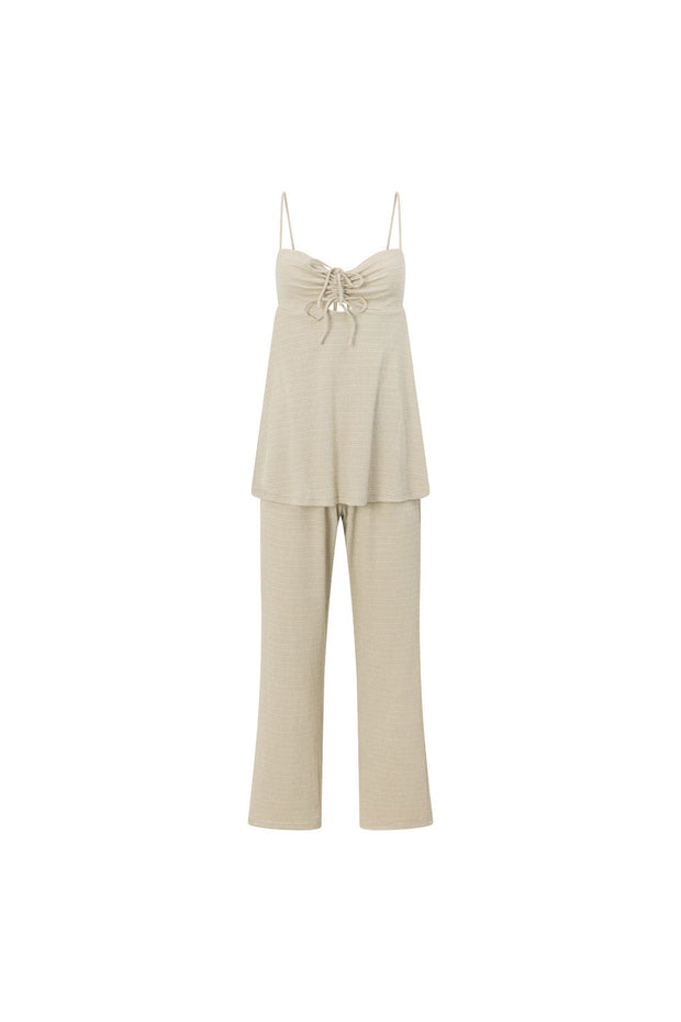 A flattering, easy-to-wear shape in a flattering colour way! The Alondra Jumpsuit is made from a waffle weave fabric in a soft sage hue. It features rouleau straps, fitted bust with keyhole cutout and gathered draw tie detail at centre, longline flouncy top with a low slung back neckline and tie closure and relaxed pants. Add the Tamia Heels for a super chic look! Designed exclusively by Sabo.