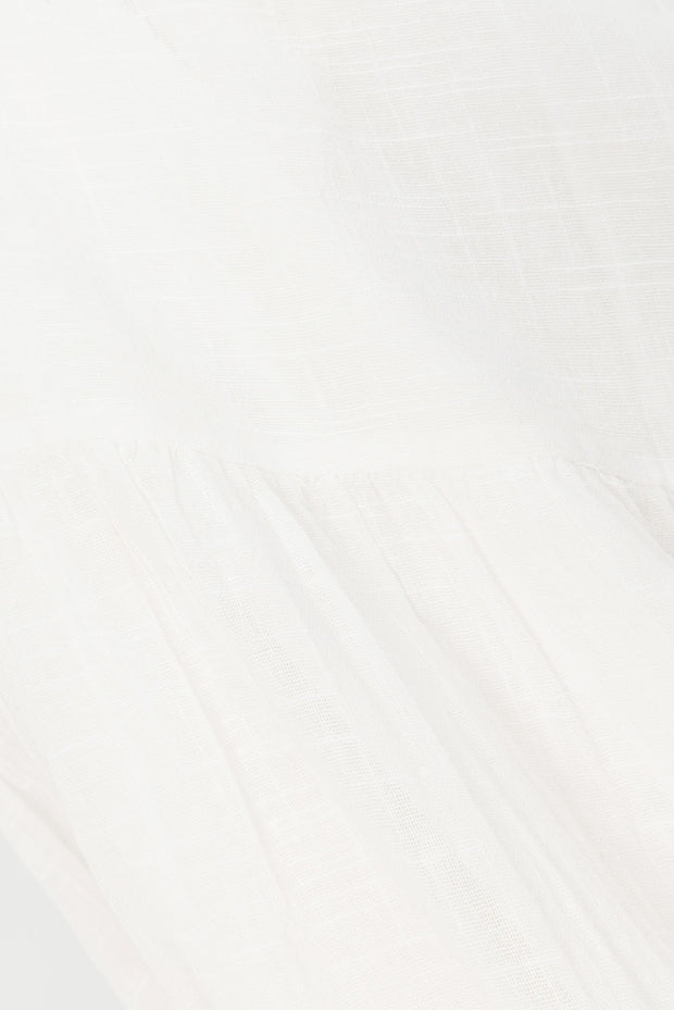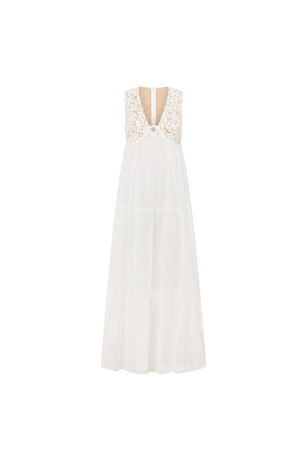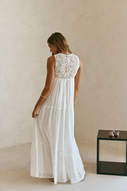 The dreamy Amia Dress is made from a natural cheesecloth cotton fabric in white. It features a fitted crochet bust with V neckline, tri cutout and tie detail at centre bust, twin pockets and a flouncy gathered panel maxi skirt. Add a heeled sandal for the perfect look for your next event! Designed exclusively by Sabo.