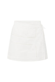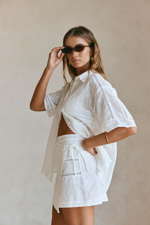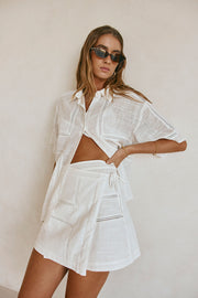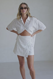 Wear it as a set or use it as a styling piece, the Banks Skirt is made from a natural cotton cheesecloth fabric in white. It is a high waisted style featuring a wrap panel at front with side tie closure, lace panel detailing and mini length hem. Get the set with the Banks Top. Designed exclusively by Sabo.