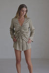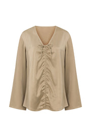 Dress it up with a pair of heels for your next night out! The Bindi Top is made from a luscious silky fabric in a khaki hue. It is a relaxed style featuring a V neckline, long boxy sleeves and drawstring tie detail at centre front. Draw as much or as little as you like to achieve the desired look! Pair with the Bindi Shorts. Designed exclusively by Sabo.