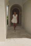 *BACK IN STOCK* A simple design elevated with detail! The Cerelia Top is made from a high quality cotton fabric in white. It features a V neckline with covered button and tie closure, sheer lace trim details and a flared longline hem. Style your look with the Cerelia Shorts and Asuka Platform Sandals. Designed exclusively by Sabo.