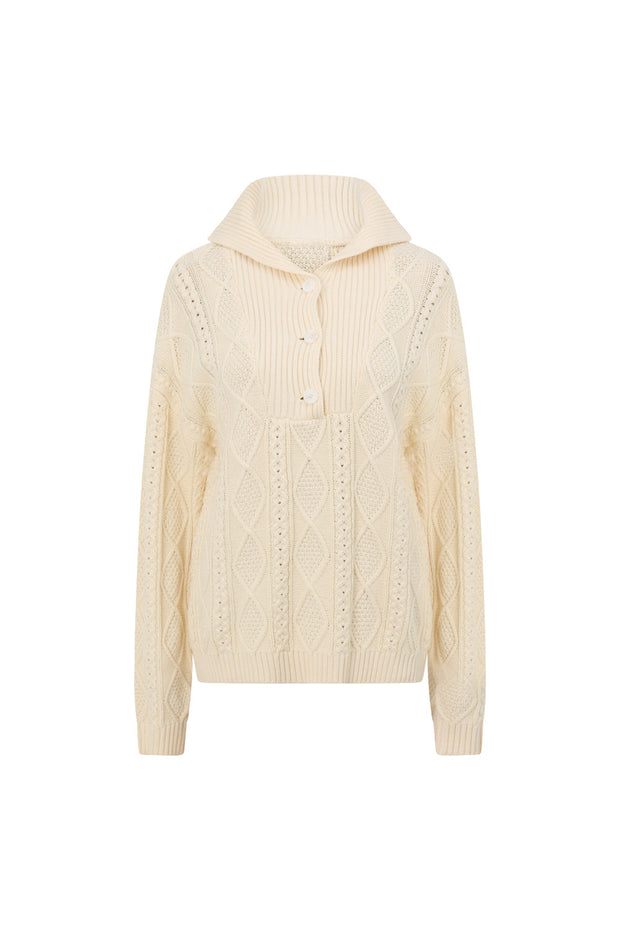 A super cosy knit that will elevate your day-to-day looks in the cooler months! The Holli Sweater is made from a high quality cotton blend cable knit in a cream hue. It is a boxy style featuring a fold over collar, buttons and ribbed detailing at neckline, drop shoulder with long slouchy sleeves and ribbed trims throughout. Get the set with the Holly Shorts. Designed exclusively by Sabo.