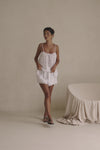 The crowd favourite Jetta set now in our natural cotton self plaid fabric in white! The Jetta Top features thin rouleau straps, adjustable draw neckline and a boxy fit. Get the look with the Jetta Shorts and Scarlett Sandals! Designed exclusively by Sabo.