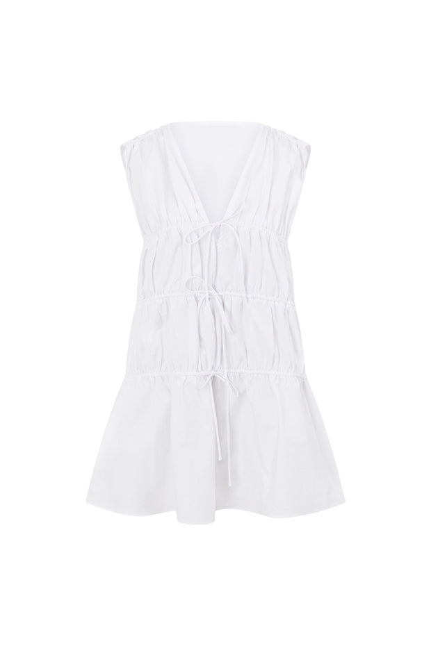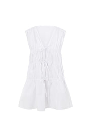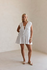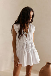 Throw it over bikinis or add heels and head to dinner! The Joslin Dress is made from a natural cotton fabric in white and features a boxy fit, gathered panels with draw tie details, V neckline and mini hem. Style your look with the Tamia Heels. Designed exclusively by Sabo.