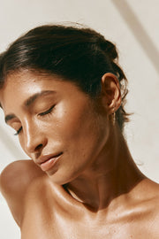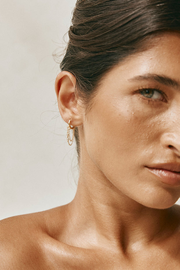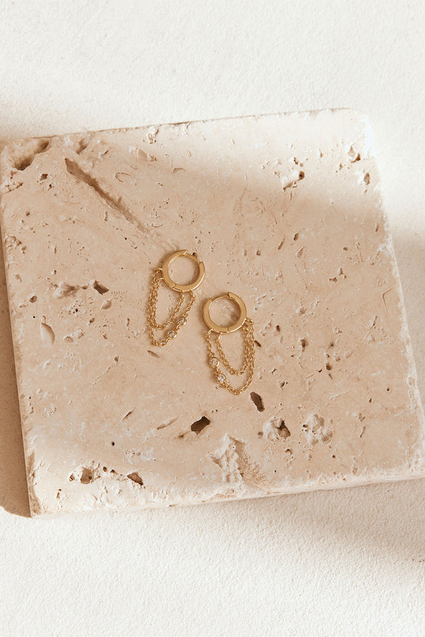 Simple and perfect for stacking, the Kartika Huggie Earrings are 18k gold plated and feature twin tassel chains with inlay gem details. Complete the look with the Twin Zephyr Ring!