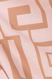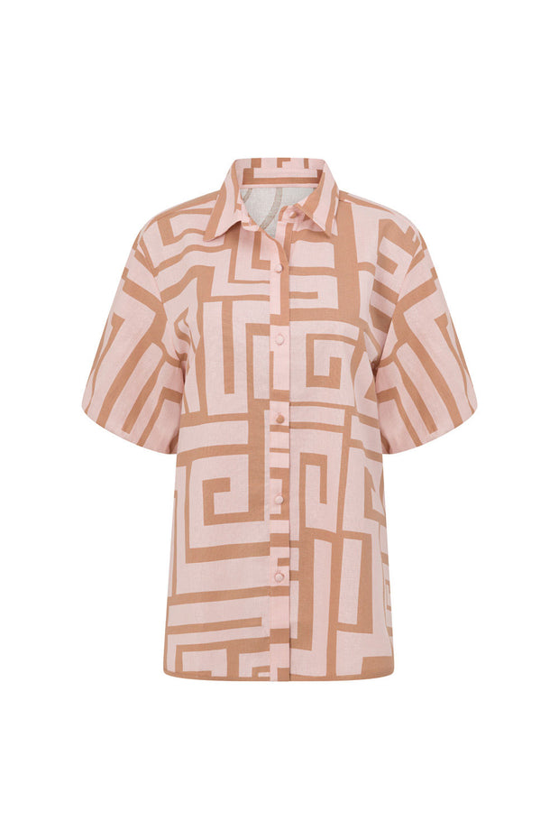 A signature SABO set, the Kira Top is made from a structured natural linen cotton blend fabric with our exclusive Hellenic Maze print. It features short puff sleeves, collar, covered button opening at front and boxy fit with curved splits at sides. Get the look with the Kira Shorts! Designed exclusively by Sabo.