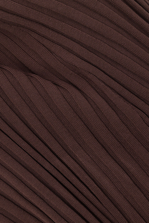 Wear it as a set or style it back with a sweater, the Laine Skirt is made from a stunning pleated knit fabric in a chocolate brown hue. It is a high waisted style featuring an elasticated waist, contrast white trims and an a-line maxi skirt. Get the set with the Laine Top. Designed exclusively by Sabo.