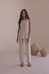 Wear it as a set or style it with jeans! The Maxine Top is a boxy style made from a cotton knit fabric in a beige stone hue. It features a wide rounded neckline and longline hem with split details at sides. Get the look with the Maxine Pants. Designed exclusively by Sabo.