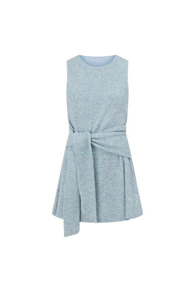A cosy, easy-to-wear style, the Narah Dress is made from a ribbed fabric in a marl blue hue. It features a high rounded neck, wide shoulders, thick wrap detail at waist and a flouncy skirt. Style your look with the Deka Sandals! Designed exclusively by Sabo.