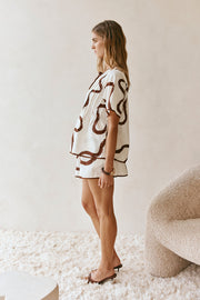 Introducing our Rayne set from our Sono Arte collection - The Rayne Top is made from a natural linen cotton blend fabric with our exclusive Marbled Mocha print. It is a relaxed fit and features contrast chocolate bind trims, split at centre neck with tie closure, short boxy sleeves, pintuck details across top and a flouncy flared hem. Get the look with the Rayne Skirt. Designed exclusively by Sabo.