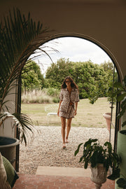 The perfect set for the cooler weather, the Sarai Top is made from a natural cotton intarsia knit fabric in our warm neutral exclusive print. It is a boxy style featuring a collar and button opening, drop shoulders with short boxy sleeves, single breast pocket and contrast chocolate brown trims. Get the set with the Sarai Skirt. Designed exclusively by Sabo.
