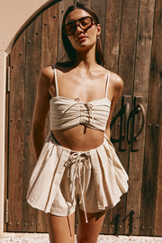 A super cute set and perfect layering styling piece! The Sydney Top is made from a high quality natural cotton linen blend fabric in a beige hue. It features adjustable bind straps, curved cropped bust with pleated detailing and functional rouched tie, cutout at waist, longline pleated top with split at front and tie closure. Get the set with the Sydney Shorts! Designed exclusively by Sabo.