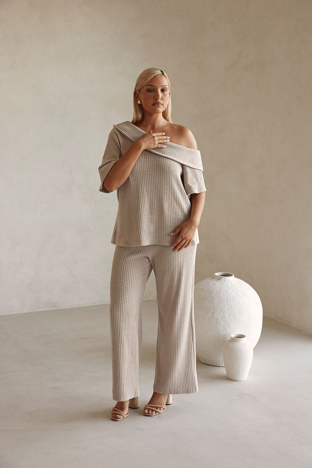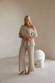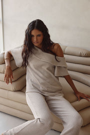 A classy set that can be dressed up with heels or kept casual with sandals! The Tarika Top is made from a comfy ribbed knit fabric in a stone hue. It is a relaxed style featuring an asymmetrical neckline with fold over panel detail and short boxy sleeves. Get the set with the Tarika Pants. Designed exclusively by Sabo.
