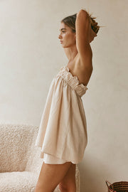 Designed to be a cute and easy-to-wear go-to set, the Toni Top is made from a luxurious cotton blend fabric in a beige hue with a textured self stripe throughout. It is a strapless style featuring a thick elastic neckline with frill detail and an oversized flouncy top. Get the set with the Toni Skirt and Tiera Platform Sandals! Designed exclusively by Sabo.
